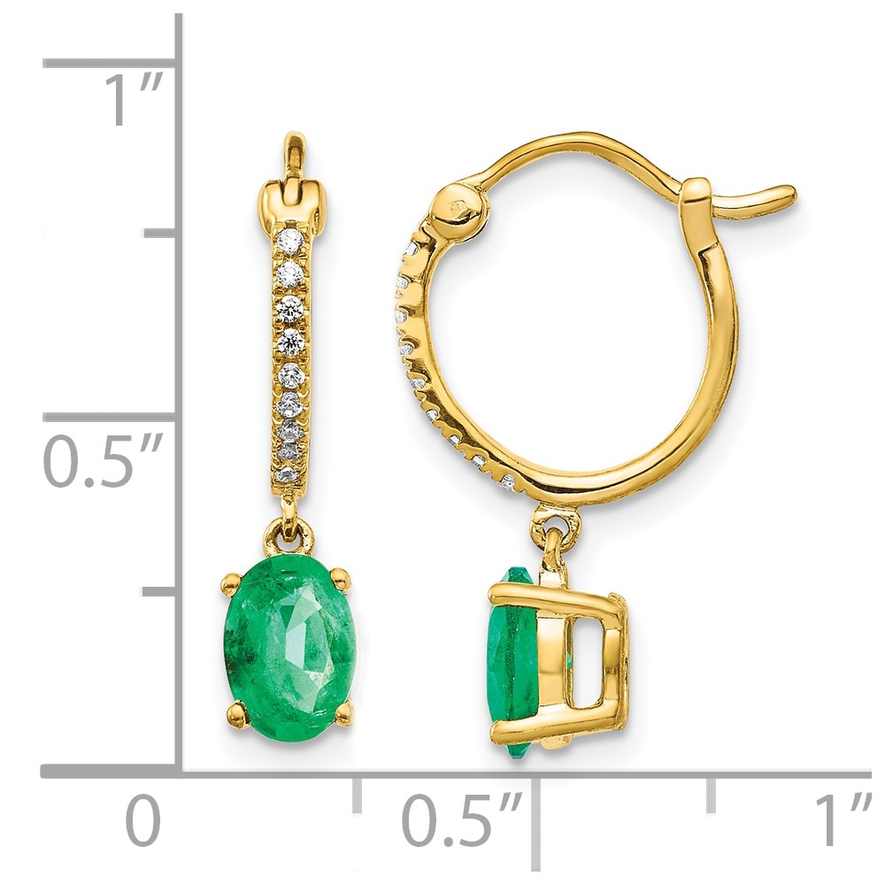 14k 1/10 carat Diamond and 7x5mm Oval Emerald Dangle Hoop Earrings