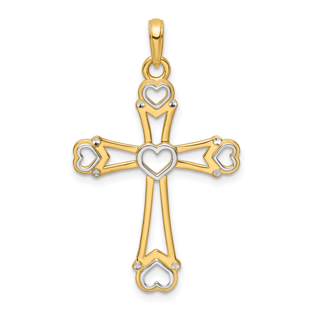 14K and White Rhodium Diamond-cut Cross with Hearts Pendant