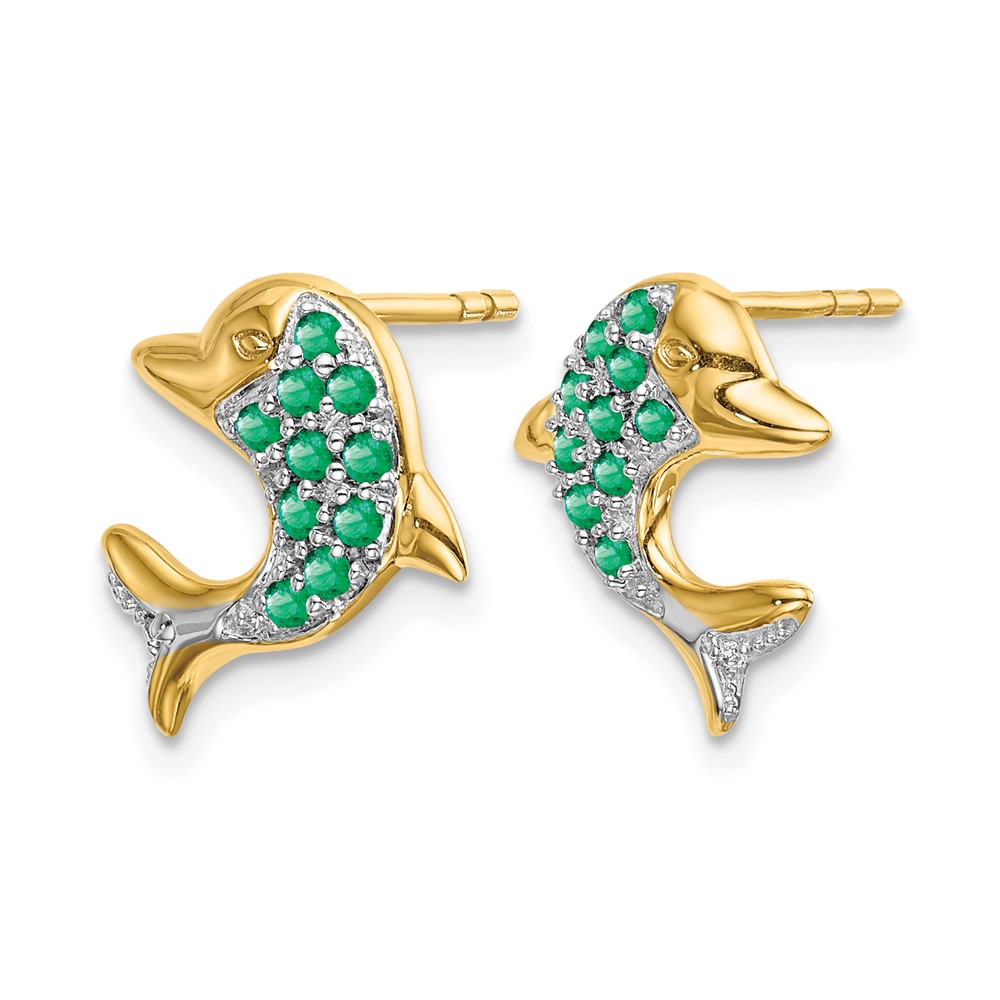 14k and White Rhodium Emerald and Diamond Dolphin Post Earrings