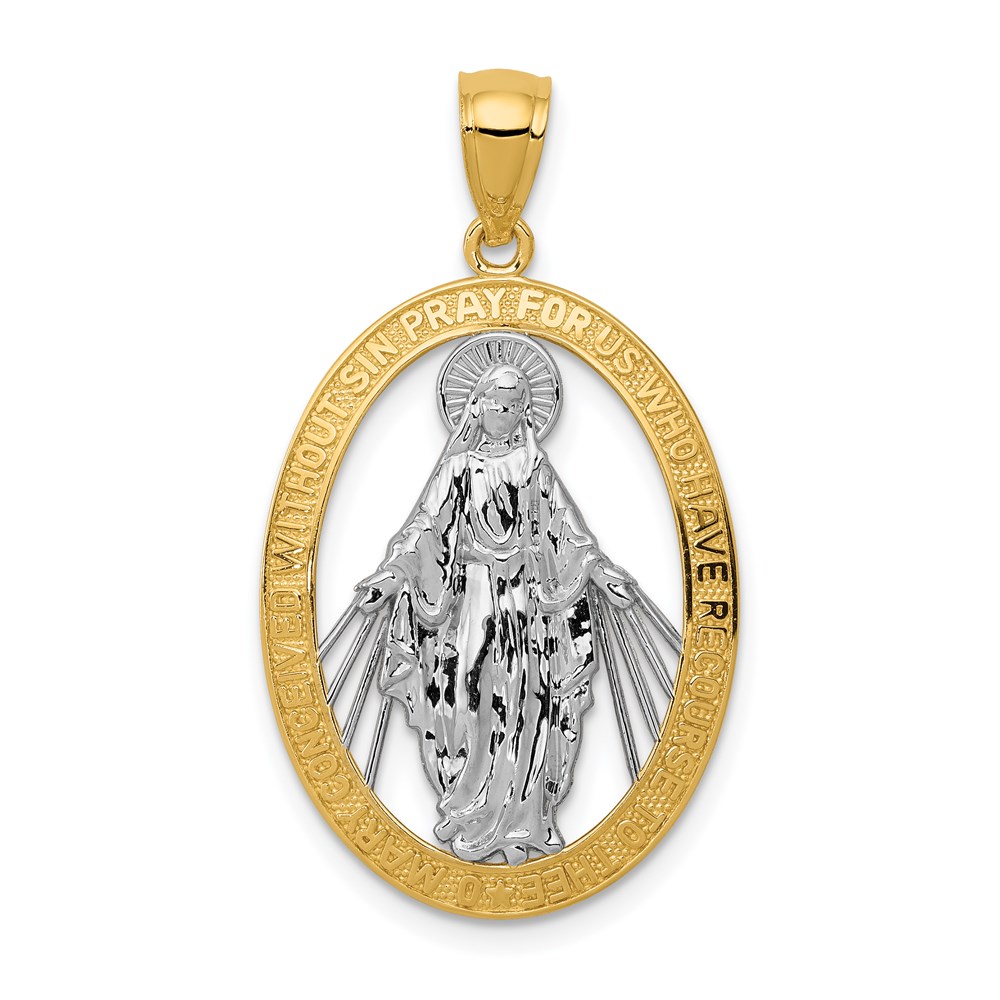 14K and White Rhodium Polished Cut-out Miraculous Medal Oval Pendant
