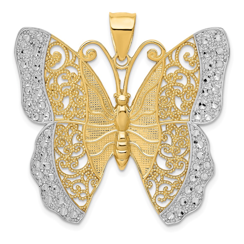 14k and White Rhodium Solid Polished Diamond-cut Filigree Butterfly Pendant