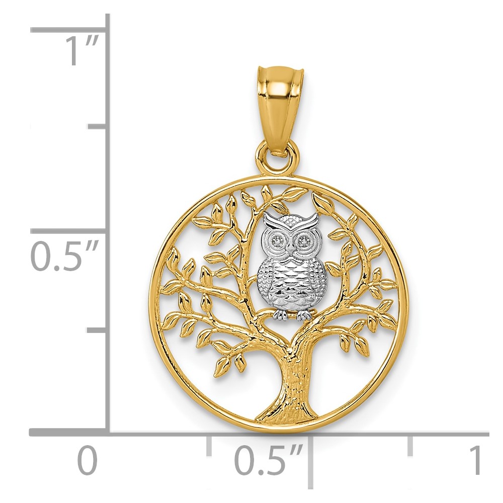 14k and White Rhodium Textured Owl Sitting In Tree In Circle Pendant