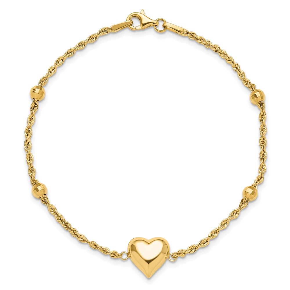 14k Polished and Diamond-cut Beaded Puffed Heart 7.75 inch Bracelet