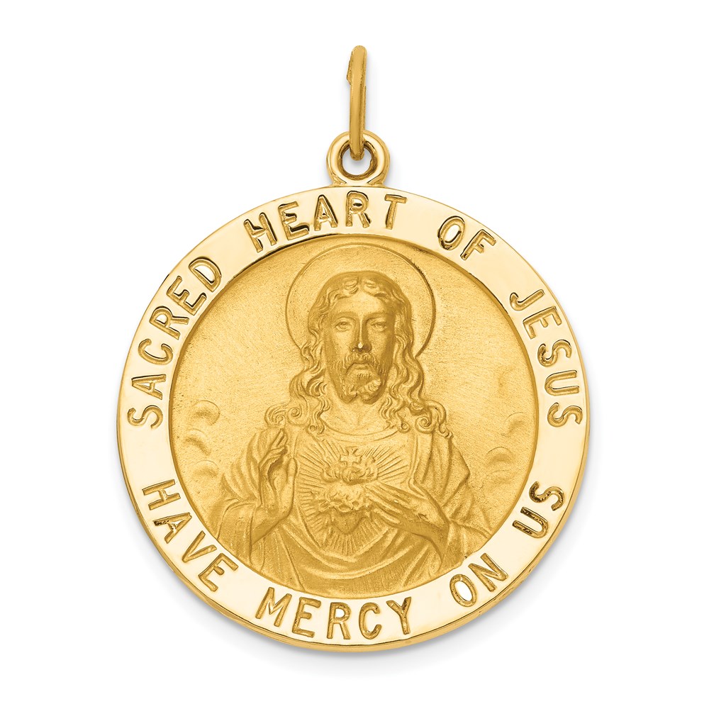 14k Polished and Satin Large Solid Sacred Heart of Jesus Medal Round Pendant