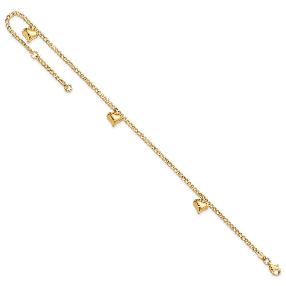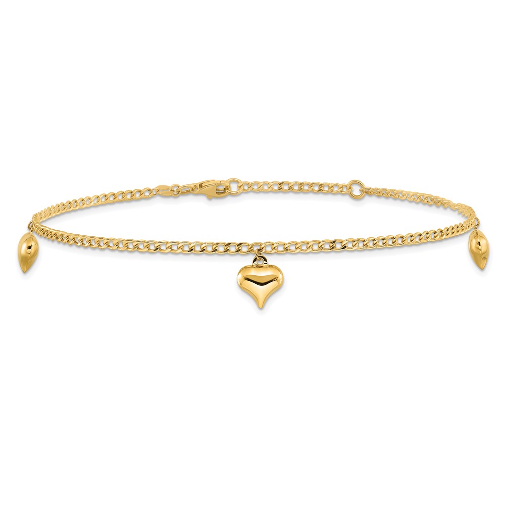 14K Polished Curb Chain with 3 Puffed Heart Dangles Plus Extender – Total Anklet