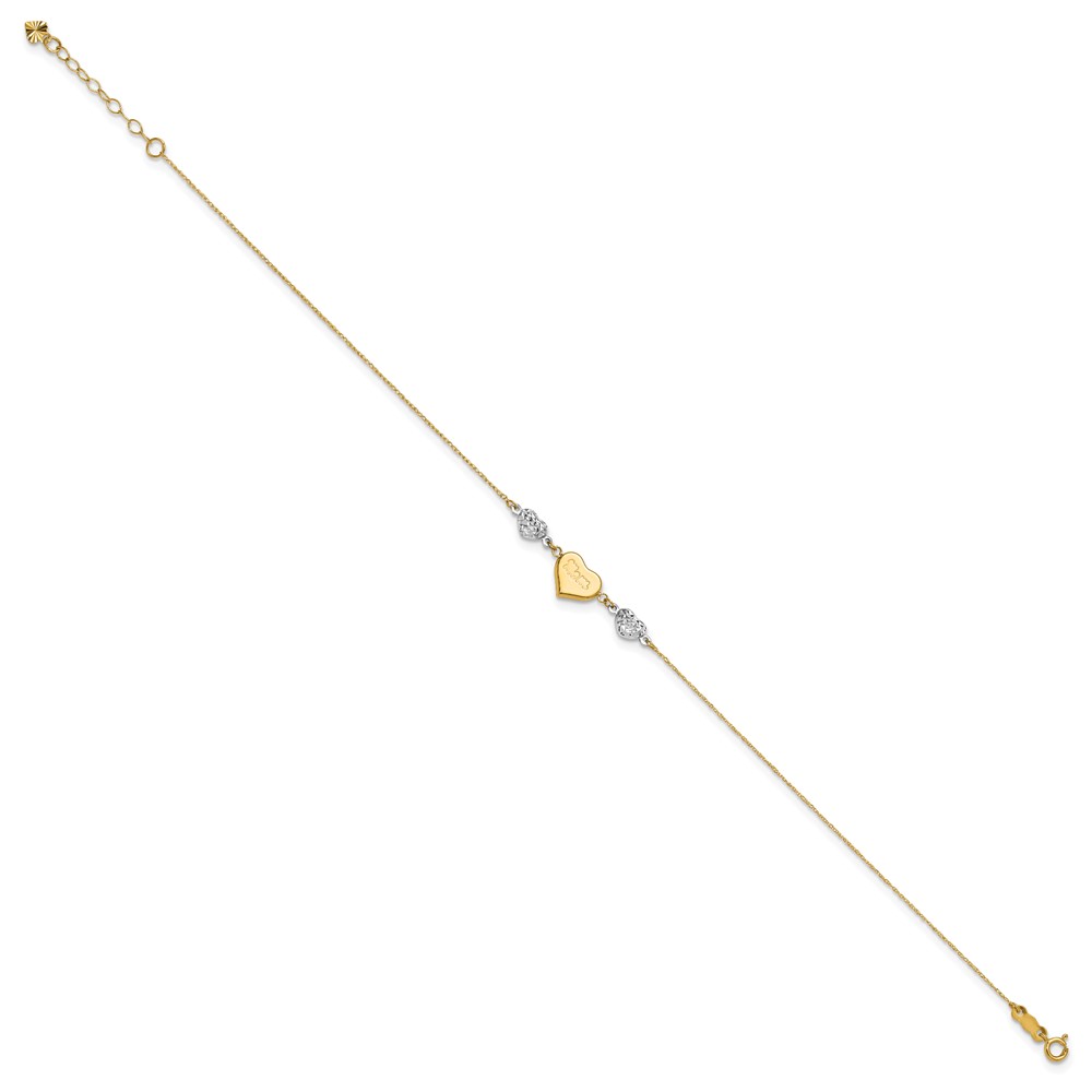 14K Two-tone Three Hearts and Diamond-cut Beads Plus Extender - Total Anklet