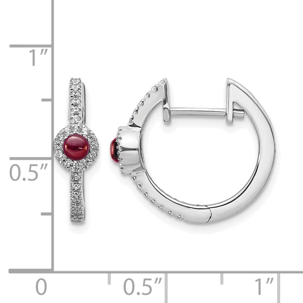 14k White Gold 2.7mm Round Ruby Cabochon and Diamond Hinged Hoop Earrings