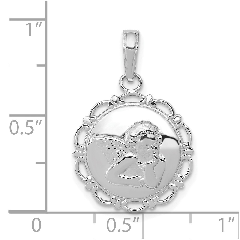 14K White Gold Polished Angel Cherub on Round Scallop Frame Pendant