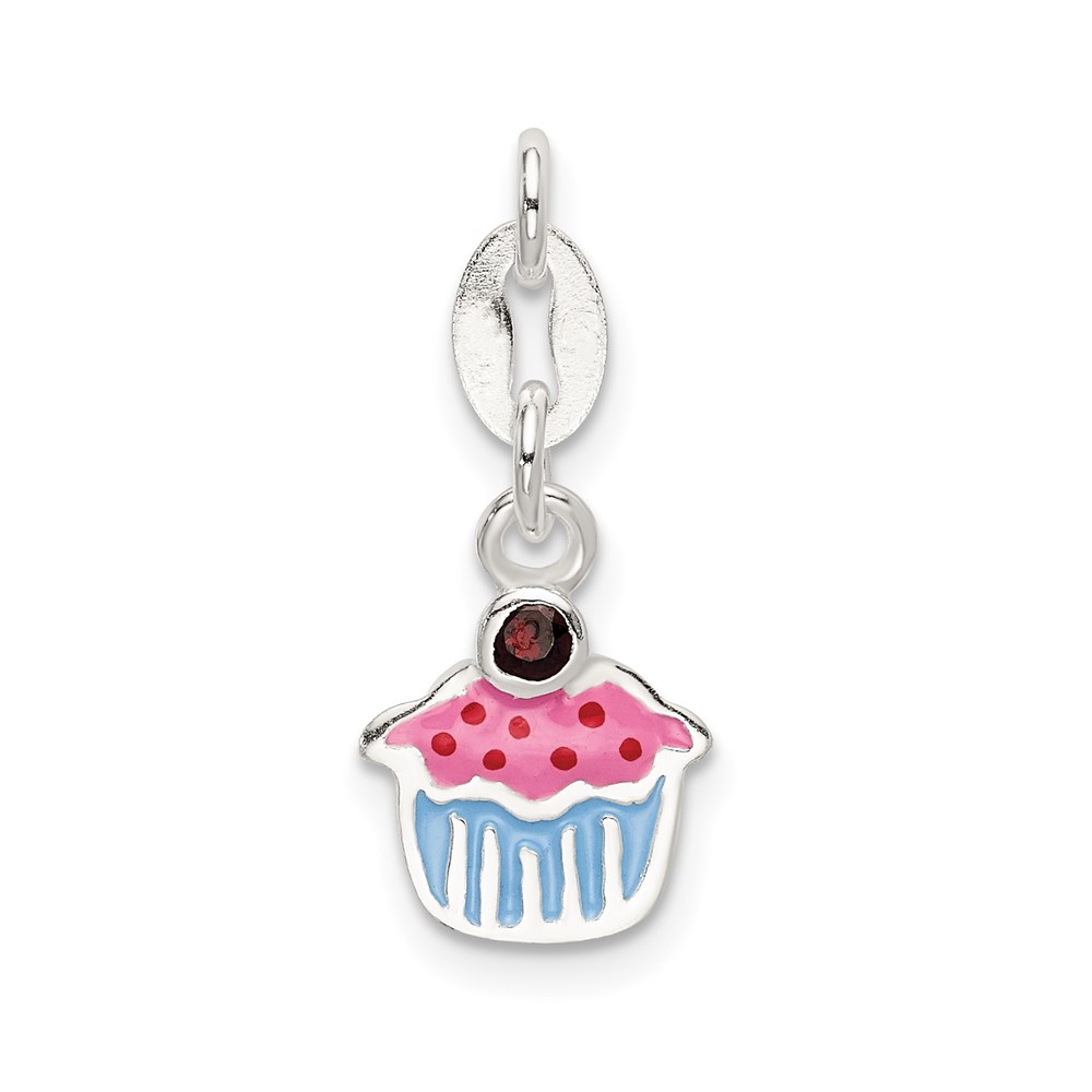 Sterling Silver Polished and Enameled Cupcake w/Garnet Charm