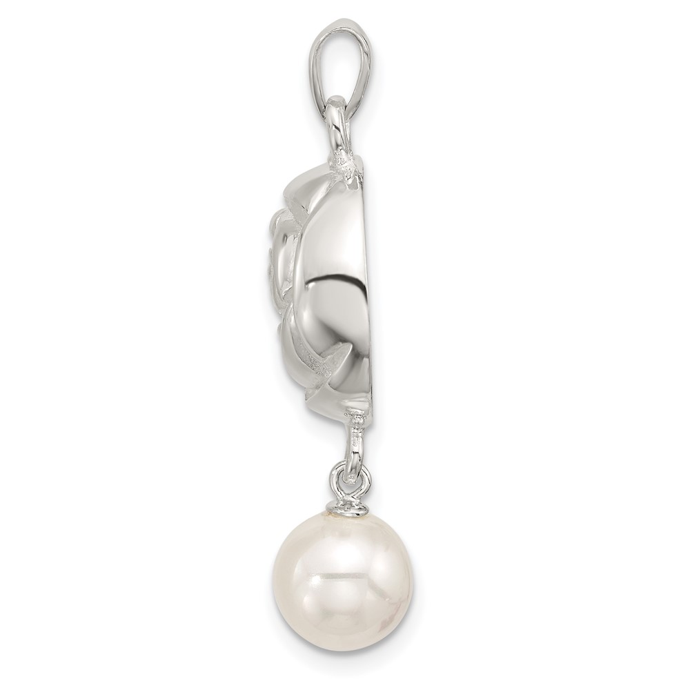 Sterling Silver Polished Textured Domed Flower with Dangle Pearl Pendant