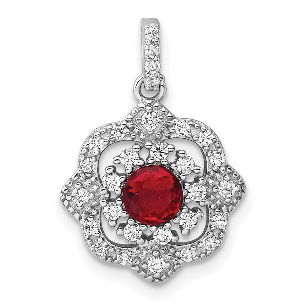 Sterling Silver RH-plated Red Glass & Clear CZ Fancy Vintage Pendant