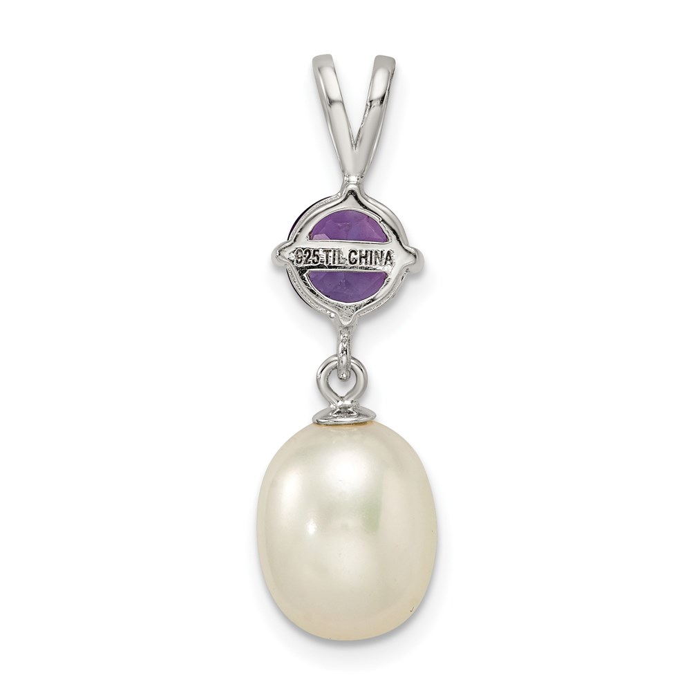Sterling Silver Rhodium-plated 8-9mm White Teardrop Freshwater Cultured Pearl and .75AM Amethyst Pendant