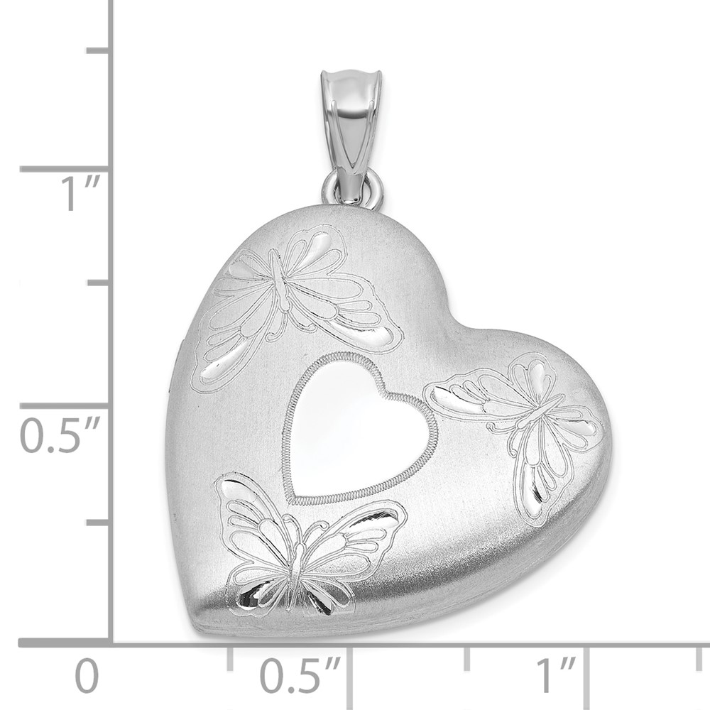 Sterling Silver Rhodium-plated Brushed Diamond-cut Butterflies 24mm Heart Locket