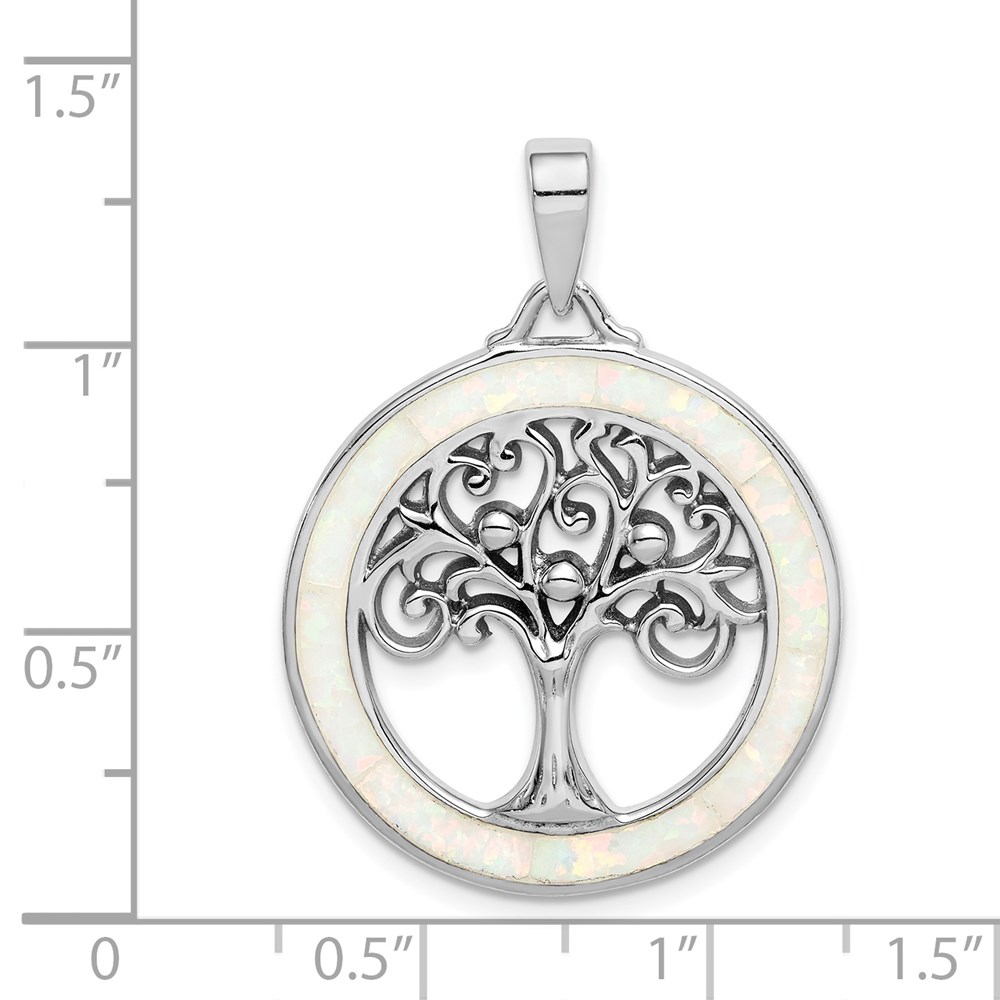 Sterling Silver Rhodium-plated Created Opal Circle w/Tree Pendant
