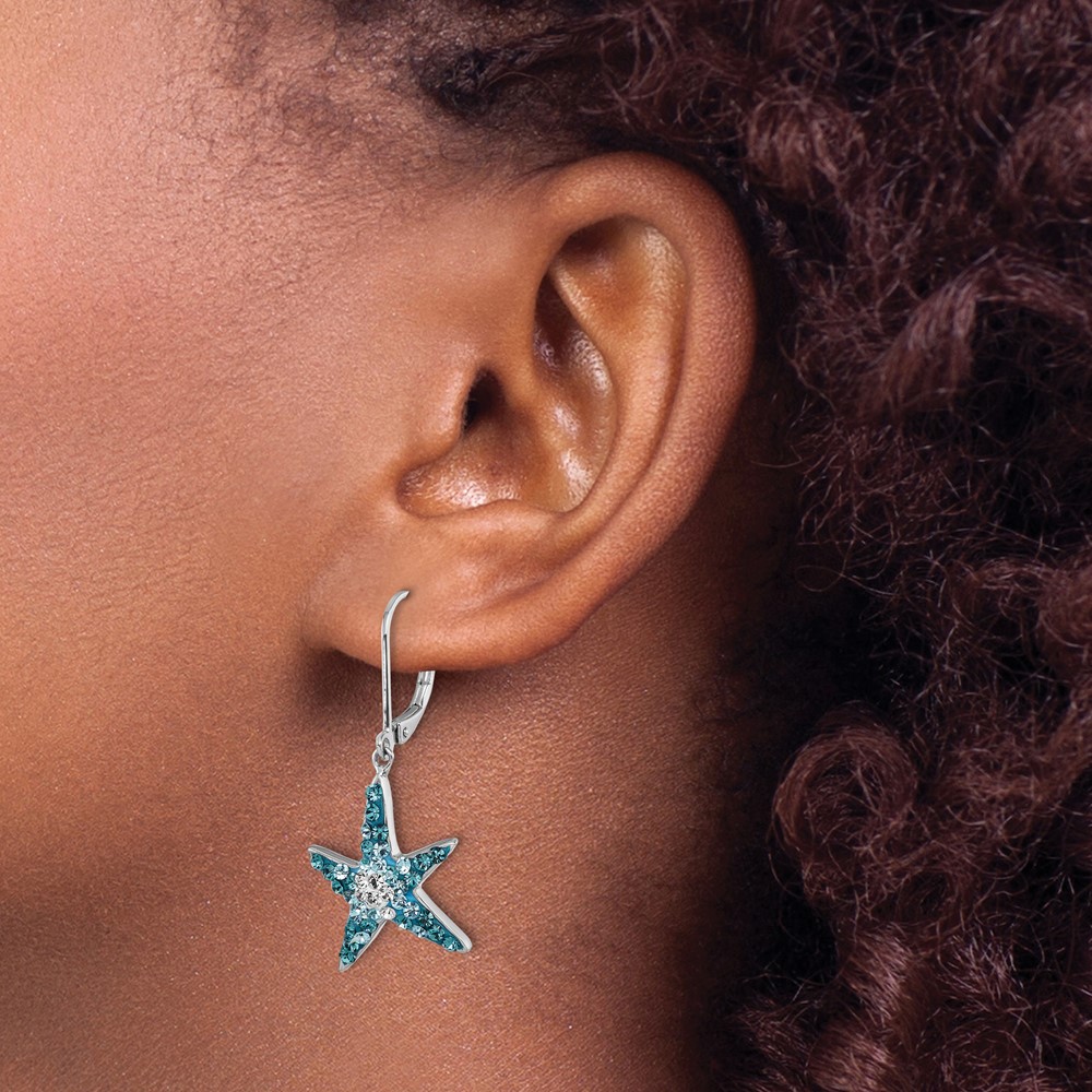 Sterling Silver Rhodium-Plated Polished Blue and White Crystal Starfish Leverback Earrings