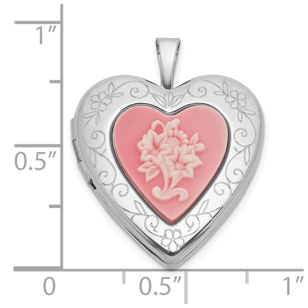 Sterling Silver Rhodium-plated Polished Front/Brushed Back Pink Flowers Resin Cameo 20mm Heart Locket